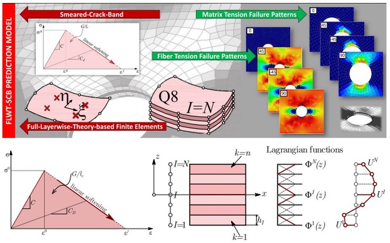 Laminar composites are extensively used in civil engendering due to their exceptional strength, stiffness, corrosion resistance, and cost-effectiveness. They are ideal for high-reliability applications. The 21st century’s focus on environmental protection has led to increased use of natural-based materials like cross-laminated timber (CLT) in building construction. CLT panels have a high stiffness-to-weight ratio, making them well-suited as load-bearing elements, such as walls and floors. The optimal design of laminar composites is often hindered by uncertainties in failure prediction and the computational costs associated with progressive failure analysis (PFA), particularly for larger structures. This study introduces a novel prediction model that combines the smeared crack band (SCB) damage model with the full layerwise theory (FLWT). The aim is to enhance the computational efficiency of PFA in laminar composites while maintaining the accuracy of 3D finite element models. The SCB model accurately captures the response of damaged lamina in both fiber and matrix directions using distinct strain-softening curves, ensuring a precise representation of post-failure behaviour. The damage law is derived based on the assumption that the total energy required to cause failure in an element (released strain energy) is equivalent to the energy necessary to create a crack passing through it. To alleviate mesh dependency, the fracture energy is scaled by a characteristic element length. Failure initiation and modes are determined using the Hashin failure criterion. Furthermore, the model is extended to consider different failure behaviour of timber in tension and compression. This extension enhances the computational framework’s applicability to the field of computational mechanics for bio-based composites, such as CLT. The validity of the model is then confirmed through an extensive experimental program carried out at the Faculty of Civil Engineering, University of Belgrade. Application of layered finite elements for continuum damage modelling in laminar composites remains largely unexplored in literature, particularly when combined with the SCB damage model. The FLWT-based model accurately captures the 3D stress state within each lamina, including continuous transverse stresses between adjacent layers, crucial for accurate prediction of failure initiation. Furthermore, the FLWT demonstrates a weak correlation between the size of the considered domain and the mesh, presenting a notable difference from standard finite element models. The developed FLWT-SCB prediction model is integrated into an original FLWTFEM framework, offering a user-friendly graphical environment for easy visualization of input and output data. The proposed model’s efficiency has been verified using numerous benchmark examples during progressive failure analyses of laminar composites and CLT panels with arbitrary geometries, loading and boudary conditions and stacking sequences. The model has demonstrated its accuracy in predicting the response of both intact and damaged laminar composites, and valuable recommendations for future research in this field are included.