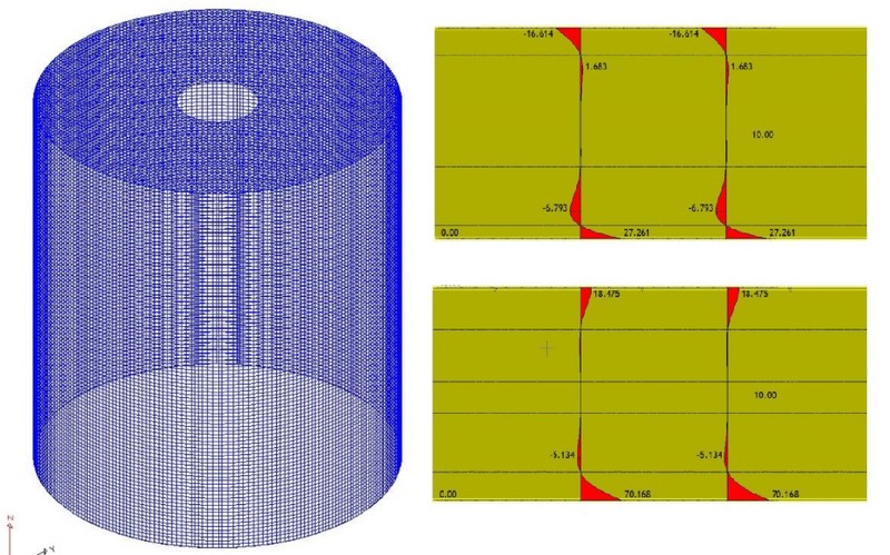 U okviru diplomskog rada analizirani su uticaji u AB cilindričnom rezervoaru oslonjenom na elastičnu podlogu. Primenom programskog paketa Tower 8, zasnovanog na metodi konačnih elemenata,određeni su uticaji za tri različinte krutosti tla i usled delovanja opterećenja od sopstvene težine, seizmičkih uticaja, hidrostatičkog i hidrodinamičkog dejstva vode.Takođe, primenom analitičkog rešenja zasnovanog na teoriji savijanja tankih ploča i ljuski,određeni su uticaji usled dejstva sopstvene težine i hidrodinamičkog pritiska za dva idealna slučaja oslanjanja–uklještenje i slobodno oslanjanje. Na osnovu analize dobijenih rezultata izvedeni su odgovarajući zaključci.