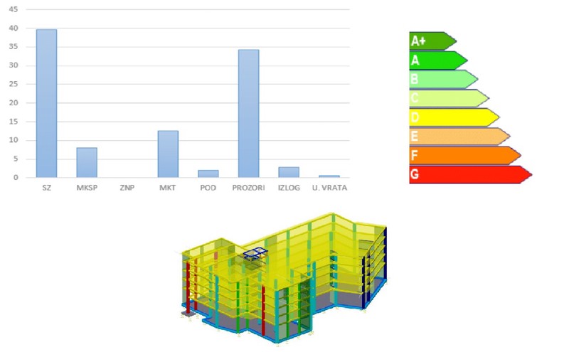 Predmet ovog diplomskog rada je analiza nove četvorospratne stambeno-poslovne zgrade u Kraljevu sa aspekta energetske efikasnosti i seizmičke otpornosti. U radu je izvršen proračun elaborata energetske efikasnoti,izrada energetskog pasoša i procena ponašanja konstrukcije pri seizmičkom dejstvu.Prvo je izvršen proračun za postojeće stanje objekta,a zatim su analizirana različita varijantna rešenja postojećeg projekta.Pri izradi rada poštovan je Pravilnik o energetskoj efikasnosti zgrada (Službeni glasnik RS, br. 61/2011), dok su seizmički uticaji izračunati pomoću programskog paketa Tower. U ovom radu je razmatrano ukupno četiri varijantna rešenja i to: 1)postojeće stanje 2)postojeće stanje sa instaliranim zelenim krovom 3)varijantno rešenje sa dodatom jednom et ažom i instaliranim zelenim krovom 4)varijantno rešenje sa jednom etažom manje i instaliranim zelenim krovom. Na kraju su na osnovu izvršenih proračuna i analiza dati zaključci o utivaju zelenih krovova na energetske performanse objekta i njihov uticaj na seizmičku otpornost zgrade.