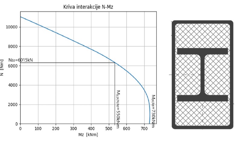 Cilj ove teme je da pokaže proračun spregnutih stubova koji se sastoje od šupljeg čeličnog Rectangular Hollow Section profil a u koji je u betoniran I–profil. Stub je opterećen aksijalnom silom i momentima savijanja oko obe glavne ose. Projektno opterećenje za razmatrani stub sastoji se od promenljivog i stalnog opterećenja. Na numeričkom primeru prikazan je proračun stuba prema Evrokodu 4, korišćenjem uprošćene metode proračuna.U programskom jeziku Python napisani su kompjuterski kodovi za proračun i iscrtavanje dijagrama interakcije oko obe ose,N-My,N-Mz, kao i program za proračun samog spregnutog stuba po uprošćenoj metodi proračuna.