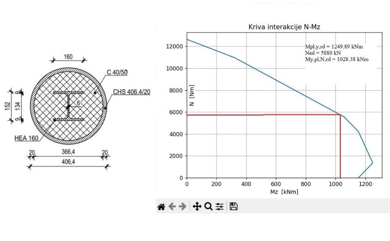 Cilj ove teme je da pokaže proračun i analizu za sračunavanje N-My dijagram a interakcije kod spregnutih stubova od šupljih čeličnih profila kružnog oblika ispunjenih betonom i sa ubetoniranim čeličnim I profilom. Stub je opterećen aksijalnim silama i momentima savijanja oko y-ose. Projektno opterećenje za razmatrani stub se sastoji od porenljivog i stalnog opterećenja. Na nmeričkom primeru prikazan je proračun stuba prema Evrokodu 4, primenom uprošćene metode proračuna. Za izradu ovog zadatka korišćen je kompjuterski jezik Pyton, u kome su napisani kompjuterski kodovi potrebni za proračun i crtanje dijagrama interakcija oko y-ose, isto kao i za proračun samog spregnutog stuba po uprošćenoj metodi proračuna.