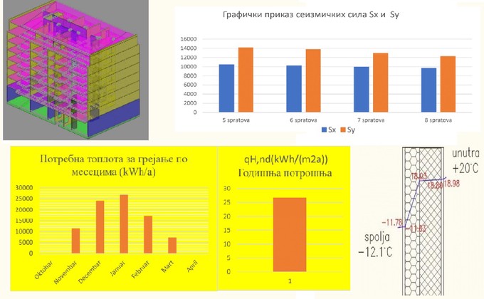 Predmet ovog rada je analiza uticaja spratnosti objekta na energetsku efikasnost I seizmičku otpornost zgrade. Razmatrane su tri zgrade, istih osnova i rasporeda nosećih elemenata, a različite spratnosti. Najpre je urađen proračun energetskih performansi zgrade i njena energetska sertifikacija na osnovu Pravilnika o energetskoj efikasnosti zgrada. Termički omotač zgrade je usvojen sa ciljem da se postigne energetski razred „B“ za sva tri slučaja. Proračun godišnje potrošnje energije za grejanje je prvo urađen za zgradu sa 7, a zatim i za zgrade sa 5, 6 i 8 spratova. Seizmička analiza za sve tri konstrukcije je urađena prema važećim propisima EC8, korišćenjem programskog paketa Tower.