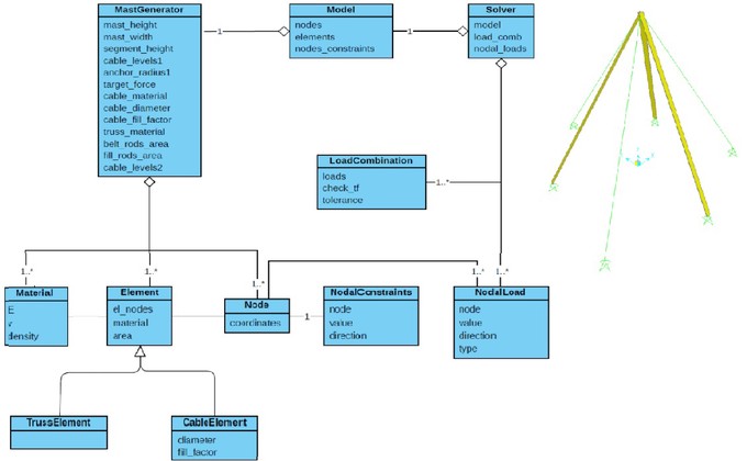 Ovaj rad predstavlja razvoj Pajton biblioteke za analizu konstrukcije čeličnih jarbola. Proračun konstrukcije jarbola i kablova je zasnovan na geometrijski nelinearnom ponašanju, jer kablovi uvek imaju nelinearno ponašanje pri statičkom opterećenju. Metod korišćen za rešenje problema geometrijske nelinearnosti je iterativni metod zasnovan na rešavanju nelinearnog sistema jednačina putem Njutn-Rafsonove aproksimacije. Za potrebe rešavanja problema napisana je objektno orijentisana biblioteka koristeći programski jezik Pajton. Prikazani su rezultati numeričke analize i upoređeni sa rezultatima analize izvršene u programu CSI SAP2000. Na kraju su izvedeni zaključci I date preporuke za dalji razvoj biblioteke.