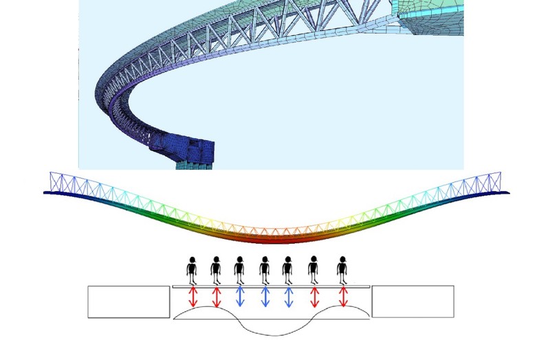 Predmet ovog master rada je analiza pešačkog vidikovca koji će biti izgradjen u naselju ,,Beograd na vodi’’ usled opterećenja koje indukuju pešaci svojim hodom. Vidikovac se sastojiod spregnute rasponske konstrukcije koja je preko armiranobetonskih kljunova uklještena uarmiranobetonske blokove. Zbog toga je opravdano bilo pretpostaviti, a zatim i napravitimodel samo spregnute rasponske konstrukcije uklještene na svojim krajevima. 3Dmodel jerazvijen u softveru ,,Abaqus’’gde su prvo modalnom analizom dobijene sopstvene frekvencije oscilovanja mosta kao i oblici oscilovanja.Koristeći preporuke pravilnika SETRA su odabrani kritični tonovi oscilovanja u kojima se mogu naći ubrzanja kojanadmašuju propisane granice. Definisana su opterećenja od pešačkog hoda i u softveru naneta na konstrukciju vodeći računa o oblicima oscilovanja konstrukcije. Za tako naneta opterećenjau softveru ,,Abaqus’’su dobijene maksimalne vrednosti ubrzanja konstrukcije.Analiziran je odgovor konstrukcije, gde je utvrđeno da minimalni uslovi komfora nisuzadovoljeni u jednom od slučajeva. Date su preporuke za smanjenje ubrzanja konstrukcije, kaoi smernice za dalji rad