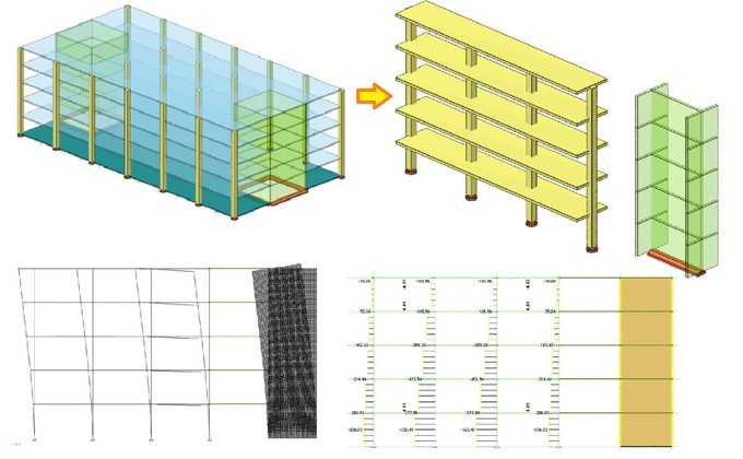 Armiranobetonska konstrukcija koja je predmet analize ovog rada je petospratna zgrada kojase sastoji od ortogonalnog sistema stubova i ploča direktno oslonjenih na stubove, kao i oddva stepenišna jezgra na krajevima zgrade. Prateći odredbe novih evropskih standarda upripremi određen je jedan zamenjujući ram koji se sastoji od 4 stuba i zamenjujućih greda, kaoi jednog zida koji je kruto vezan za ram. Glavni parametar pri određivanju zamenjujućeg ramaje bio period oscilovanja konstrukcije, tj. zamenjujući ram koji je odabran tako da period oscilovanja čitave 3D konstrukcije i 2D zamenjujućeg rama bude isti. Na taj način jepostignuto da elementi zamenjujućeg rama prihvataju iste uticaje kao i u 3D modelukonstrukcije armiranobetonske zgrade. Proračunski model zamenjujućeg rama je izmodeliran pomoću programa Radimpex Toweri na tom proračunskom modelu su izvršene analize. Prvoje izvršena analiza uticaja usled gravitacionog opterećenja, a nakon toga je izvršena analiza uticaja usled seizmičkog optrećenja koje je modelirano metodom ekvivalentnihbočnih sila. Zatim je čitava konstrukcija izdimenzionisana prateći odredbe novihevropskih standarda u pripremi. Za kraj je izvršena statička nelinearna pushover analiza u programu OpenSees. Statička nelinearna pushover analiza je izvršena na 2D modelu armiranobetonske konstrukcije, tj. na modelu zamenjujućeg rama sa kruto vezanim zidom Ipoprečnog preseka. Kao završetak ovog rada, izvedeni su određeni zaključci i ocenjeno jeponašanje konstrukcije sistema ravnih ploča direktno oslonjenih na stubove, na osnovunelinearne statičke pushover analize.