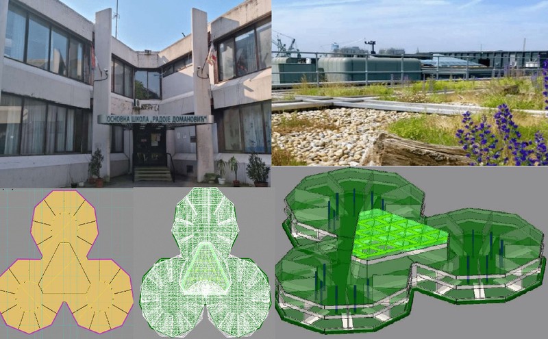 Cilj rada je bio da se na osnovu raspoložive tehnicke dokumentacije, pregleda i snimanja objekta, utvrdi mogućnost postavljanja zelenog krova. Sprovedena je globalna staticka I dinamička analiza, kao i analiza nosivosti krovne kostrukcije. Prvobitno je uradena analiza postojećeg stanja, a zatim su sprovedene analize u slučaju varijantnih resenja za zeleni krov i odgovarajuće opterećenje. Uradjen je elaborat energetske ekasnosti I energetski pasosi za postojece stanje, a zavarijantna resenja su utvrdene promene u potrebnoj energiji za grejanje. Na osnovu dobijenih rezultata, dati su zaključci u pogledu energetske efikasnosti i uticaja na konstrukciju u slučaju postavljanja zelenog krova.